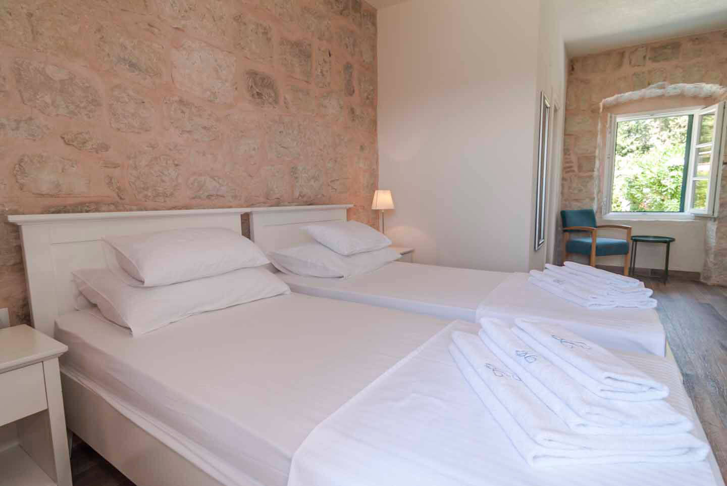 On the first floor there are two twin bedrooms and one double bedroom, with shower rooms. All bedrooms with TV and good quality bed linen. Bathrooms are inviting and provide plenty of towels and hair driers. From this bedroom floor you can walk out onto the traditional stone terrace with tiled roof and carved pillars, known locally as the "gloriette". Here is where you can sip your morning coffee, or enjoy the stunning Dubrovnik sunsets in privacy.