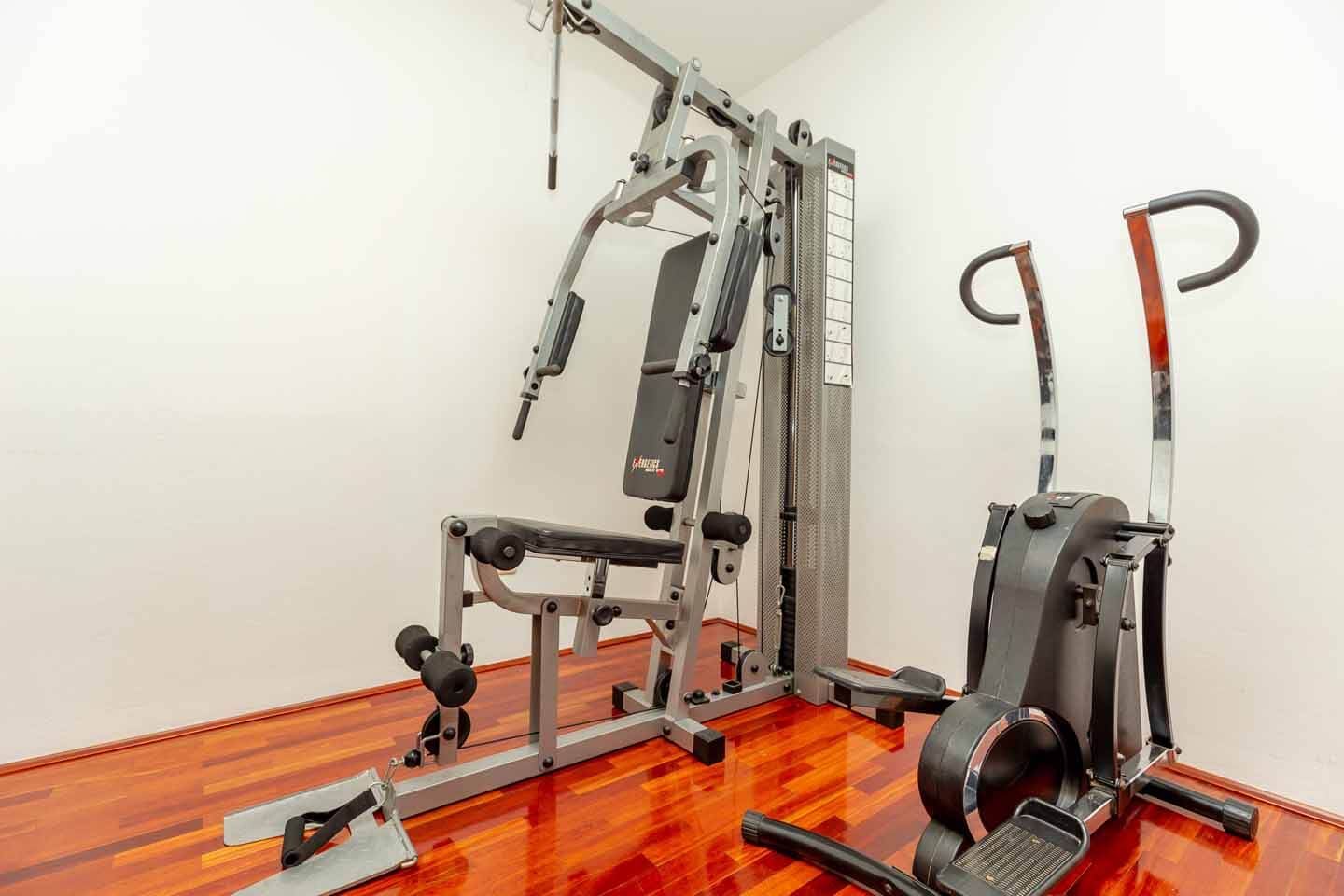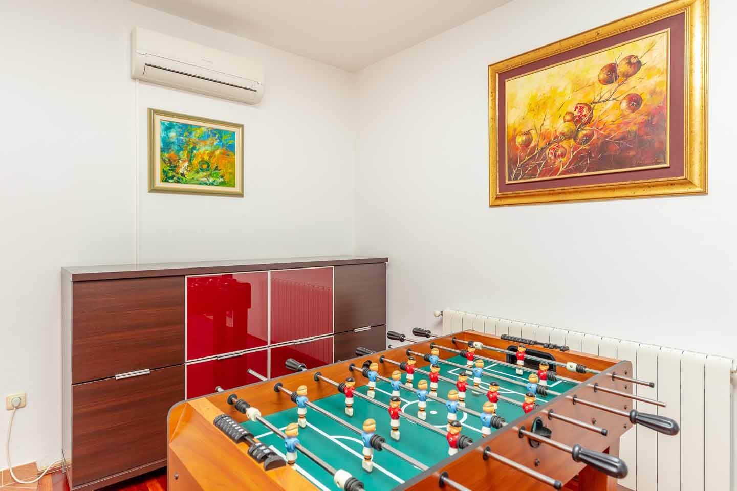 The ground floor of the villa consists of a sitting room, dining area and kitchen as well as two double bedrooms, each with a double bed and TV, and WC/shower room and an additional WC. The living room is air-conditioned and opens out on a spacious terrace, from which you can take a few steps down to the pool and the sunbathing deck. On the first floor are two further double bedrooms and a bathroom with Jacuzzi bath, as well as a living room/games room, with TV and corner seating unit, and a small fitness room. The sitting room and one of the bedrooms open out onto a balcony. The living room/games room is air-conditioned.