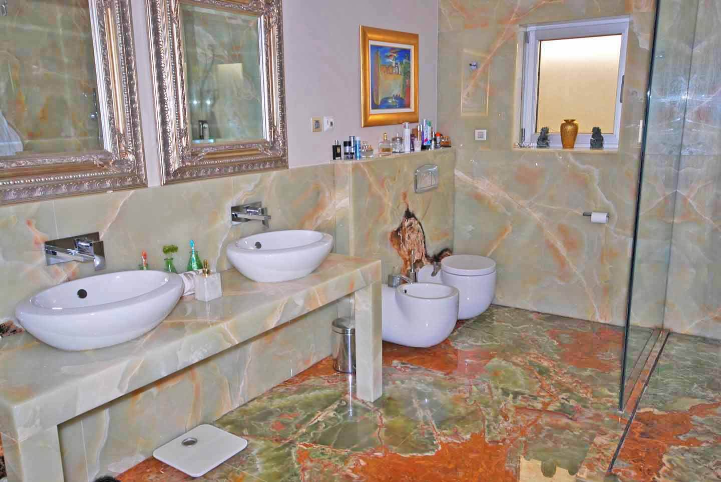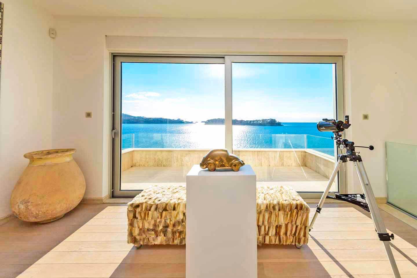 You enter the villa through a modern stone portico and stone staircase that leads down to the main entrance. Entering the foyer and the spacious main living area which is on two levels joined by a sweeping curved staircase you will be stunned by the view. All the rooms look out through large glass patios doors and wide windows over the uninterrupted panoramic view of the islands that lie offshore from Dubrovnik. On the upper level is an elegant office space and a telescope for a closer look at the yachts and ships passing between the islands. The lower level has the main lounge area with comfortable sofas and a 60" TV. This area flows into the huge kitchen and a custom made dining table for 12. The rooms are decorated with unusual items or artwork and artefacts from around the world as well as the highest quality furnishing with Swarovski chandeliers, Persian rugs and Travertino marble flooring. Three of the bedrooms are in the main villa each with ensuite bathrooms and sea views. There are two further bedrooms in the guest suite. These rooms would be suitable for older children or staff. The master bedroom of Villa Casamar stuns! You will be sleeping underneath a series of works of art from one of the greatest European artists, but despite the sleek décor of the sleeping area, the true highlight here is the bathroom. Its floors are lined with Pakistan Verde Onyx, and walls with Jade Onyx, and the roomy massage bathtub by the front window truly adds to the impression. The bedrooms have oak floors and marble bathrooms. The master bedroom has a jacuzzi bathtub by a window so that you can laze in the bath and enjoy the stunning sea view. The second double bedroom has two terraces, one with a direct sea view and the other to the side of the house in the shade. The bedrooms in the guest suite are decorated in neutral colours, and like the rest of the property have artwork on display. Each bedroom has its own shower room. One of the rooms is a mini suite with a living room and kitchen. The villa is suitable for year round use with underfloor heating and an open fireplace. It has WiFi and a full CCTV security system. The villa has a well equipped fitness room so you can keep up your exercise routine while on holiday.