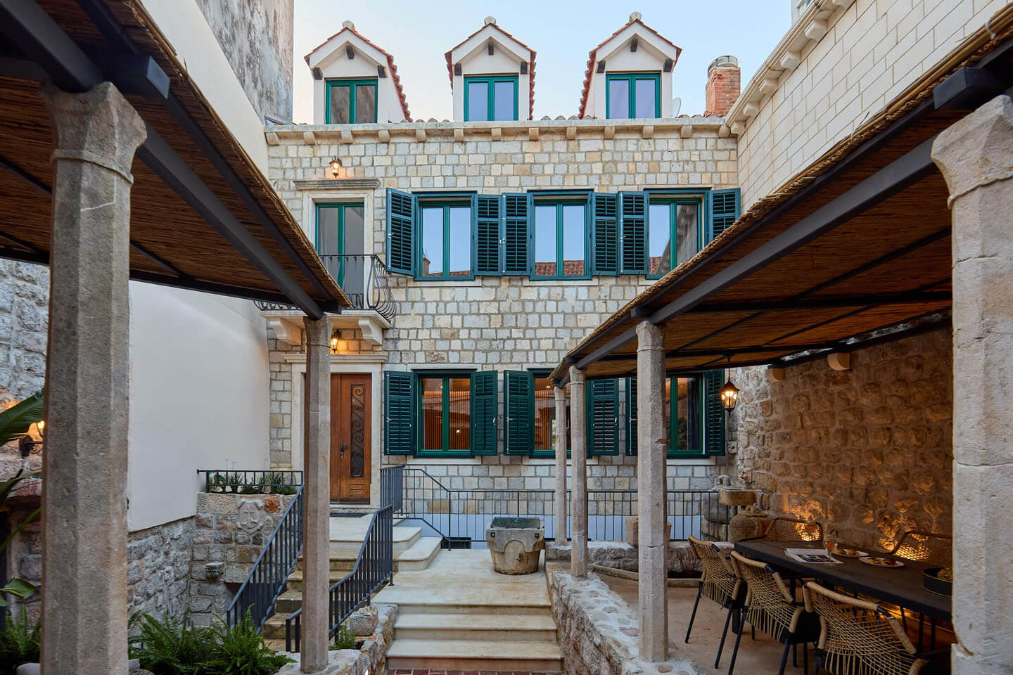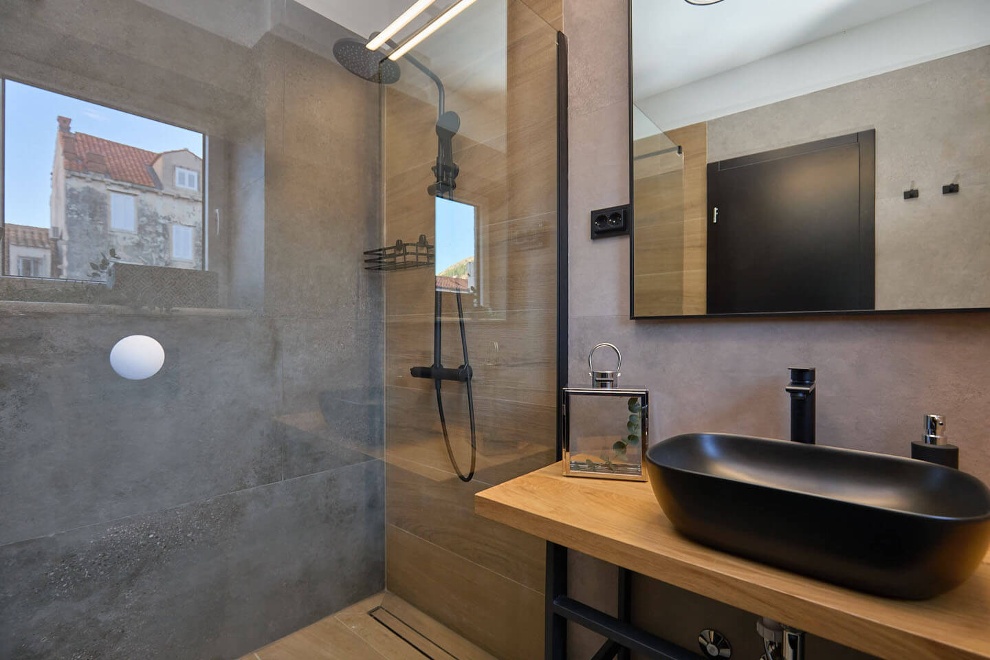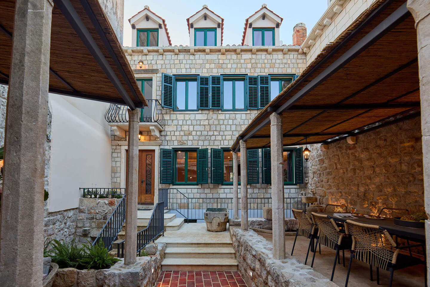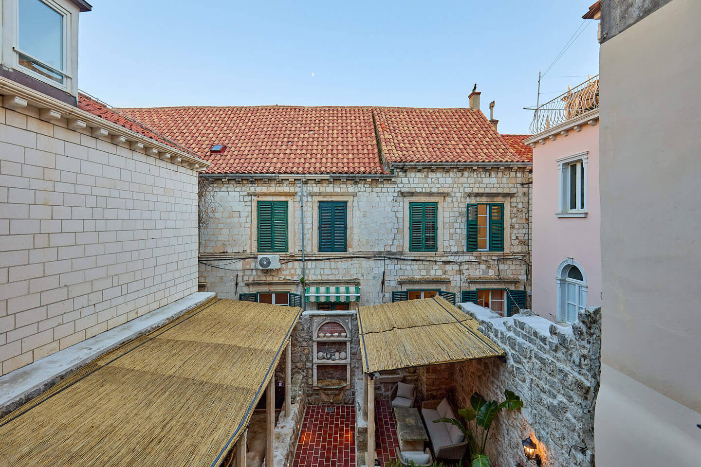 This beautiful, authentic, old stone luxury villa is a true Grande Dame of Dubrovnik. It will appeal to those who wish to experience the way of life in Dubrovnik centuries ago aided by modern technology of WiFi and air conditioning. . Thick stone walls, lovely hand carved pillars, shady terraces allow you to live like a Dubrovnik nobleman of the past but you can step out and be straight on the street where all is happening. Inside, the house has been very well modernised and is very relaxing, including air-conditioning and WiFi. This luxury holiday home consists of a four-bedroom main house for 8 guests with four bathrooms (one has a bath tub), and an additional one-bedroom apartment for 2 guests with a private bathroom which is on the grund floor.