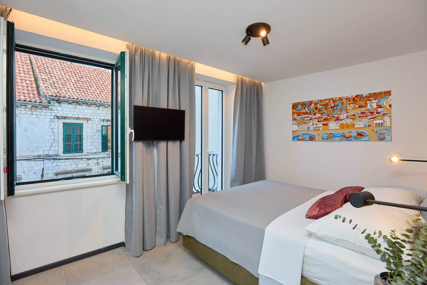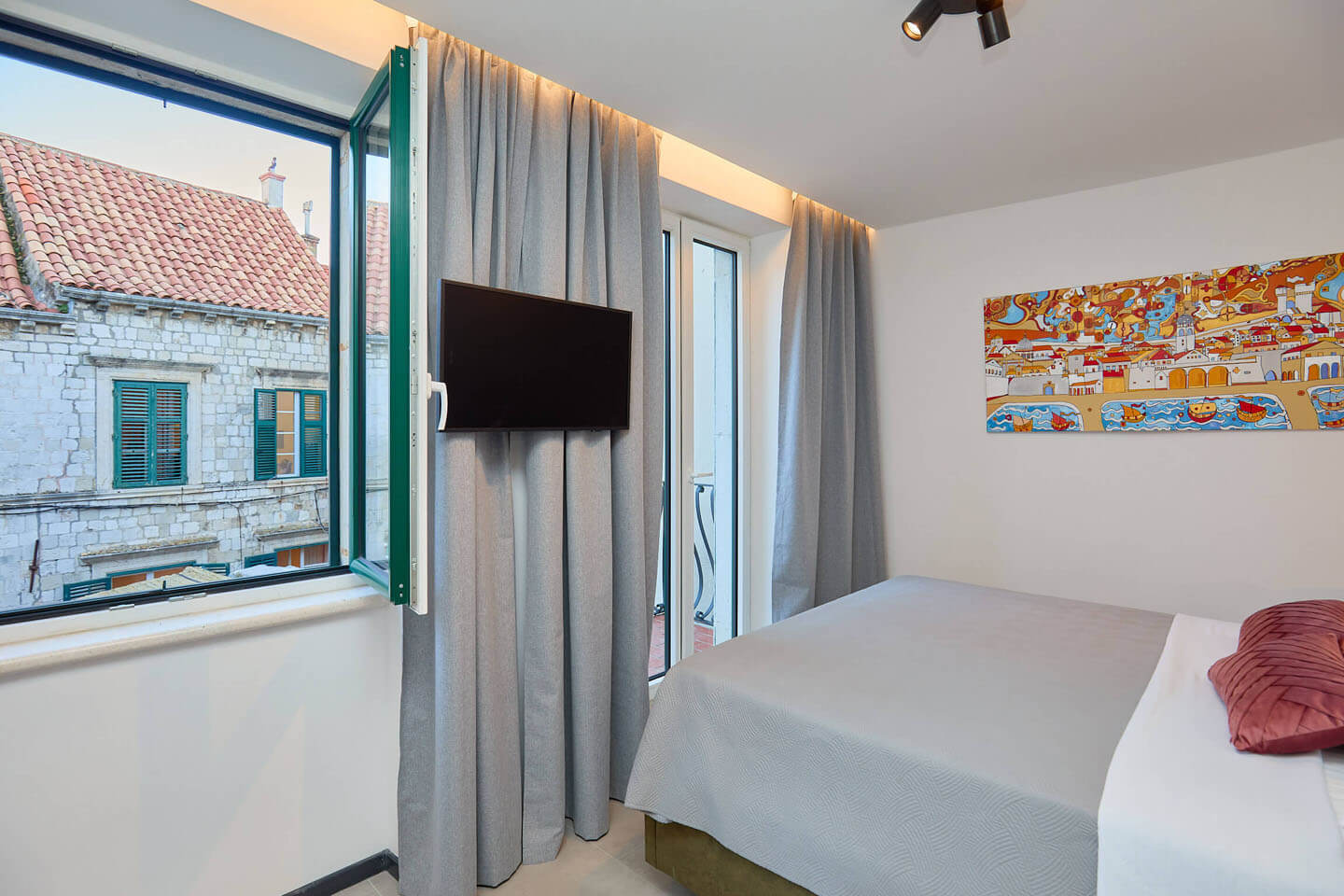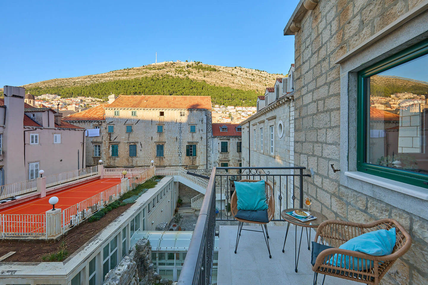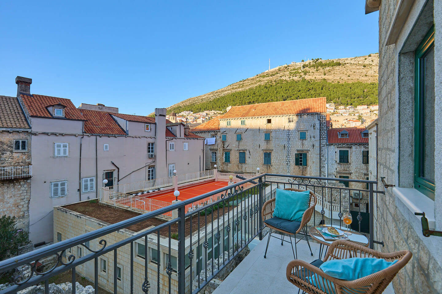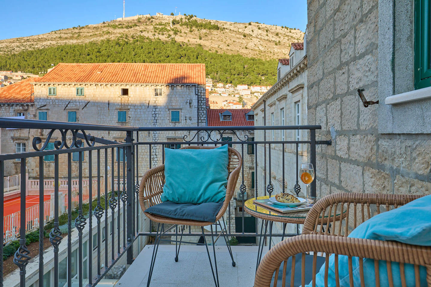 The internal staircase takes you to two double bedrooms with queen size beds (160 x 200cm) , own balconies and en-suite bathrooms. These comfortable, air-conditioned bedrooms have a lovely view of the iconic hill called Srdj. Plenty of towels and good bed linen are provided.