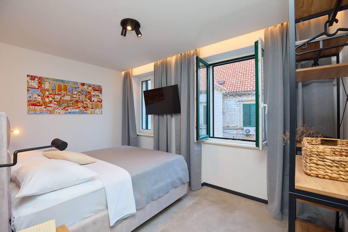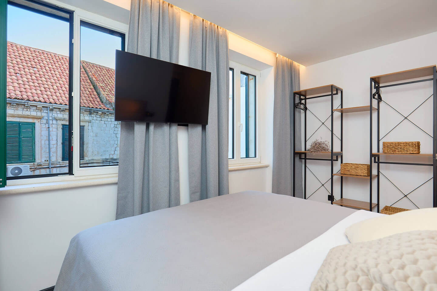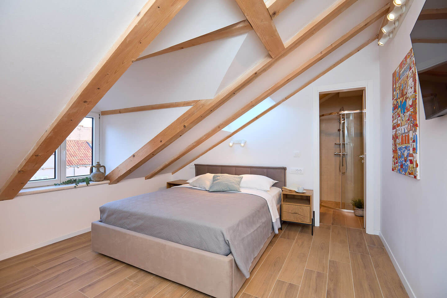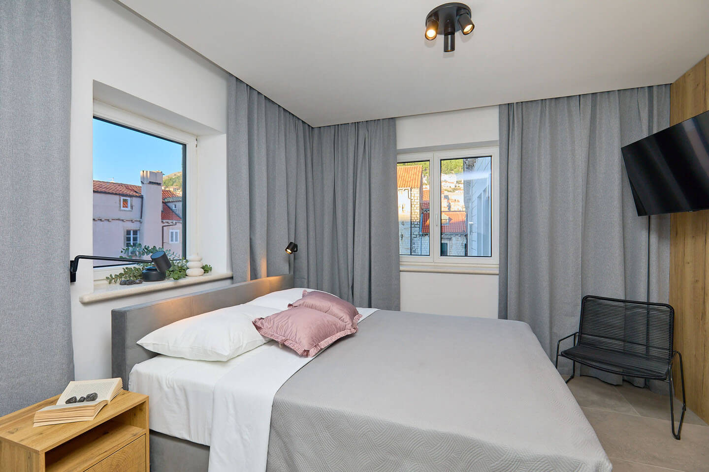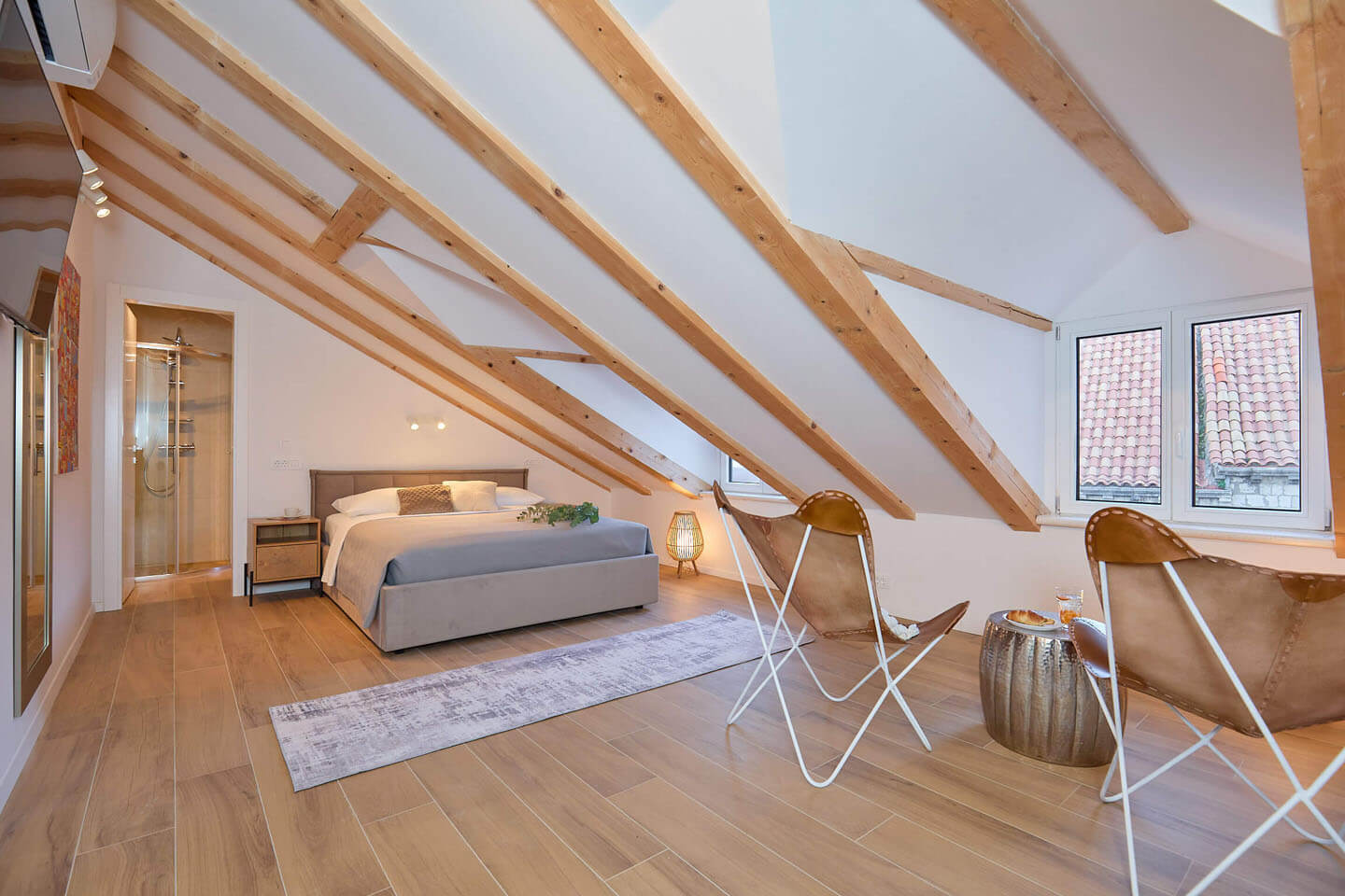 The internal staircase takes you to two double bedrooms with queen size beds (160 x 200cm) , own balconies and en-suite bathrooms. These comfortable, air-conditioned bedrooms have a lovely view of the iconic hill called Srdj. Plenty of towels and good bed linen are provided.