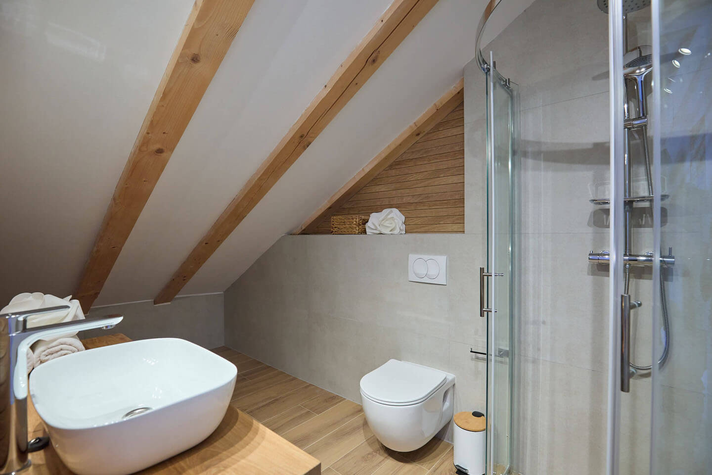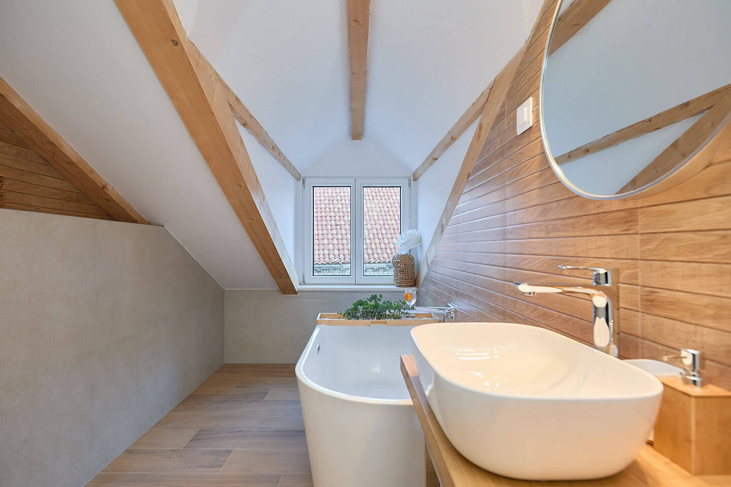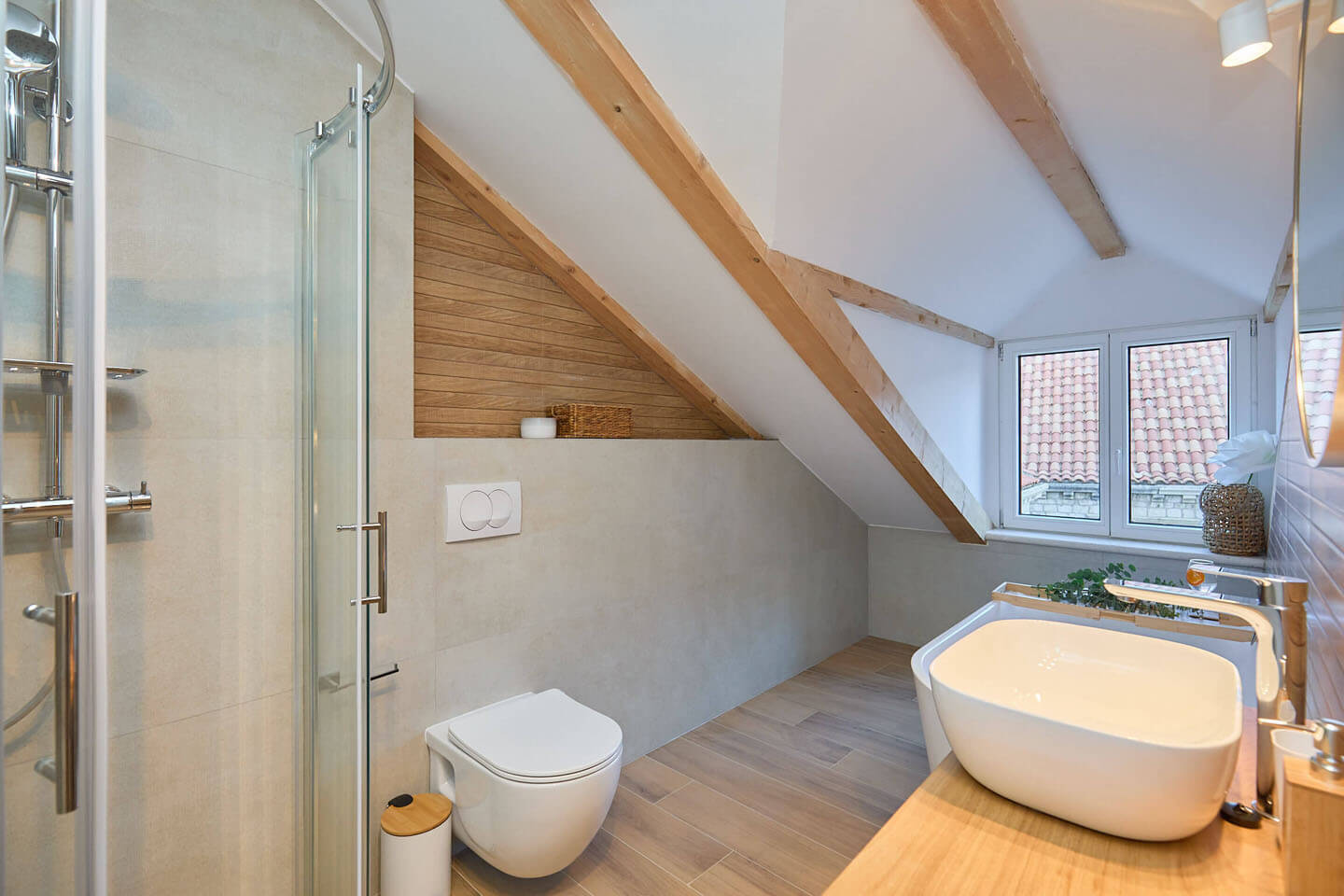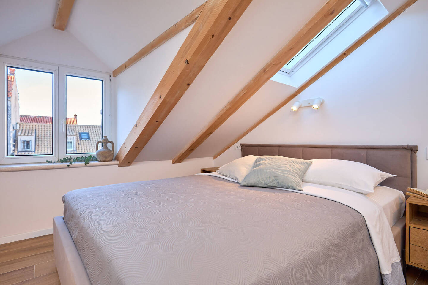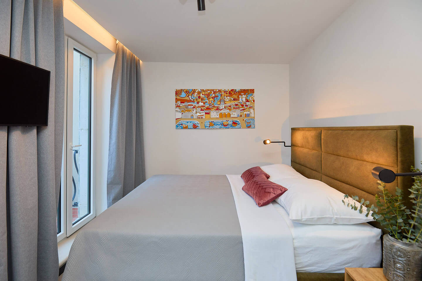 The internal staircase takes you to two double bedrooms with queen size beds (160 x 200cm) , own balconies and en-suite bathrooms. These comfortable, air-conditioned bedrooms have a lovely view of the iconic hill called Srdj. Plenty of towels and good bed linen are provided.