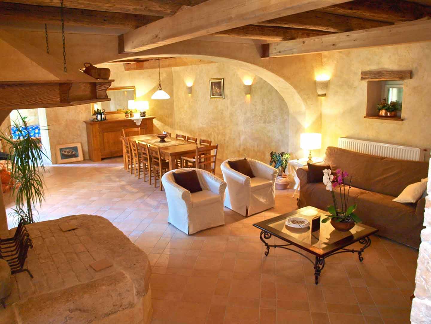 This large, cool space has an original old world charm, with Italian terracotta tiles on the floor, stone arches and heavy wooden beams on the ceiling. Subtle Mediterranean colour on the walls is in keeping with the age and style of the villa. A stunning focal point is the typical large open fireplace which was a single way of cooking in the olden days, and now provides luxurious roaring fire in the winter. The sitting room has armchairs and a three seater sofa which can be used as an accessory bed for 2 people. Satellite TV, DVD player are provided. The dining table sits up to 12 people. The original farmhouse kitchen has a huge open fireplace, the second fireplace in the living zone. It is equipped with a fridge/freezer, cooker, dishwasher, microwave, coffee machine, kettle, toaster, cooking utensils and tableware. Downstairs there is a guest cloakroom with a shower and a laundry room with a washer/drier.