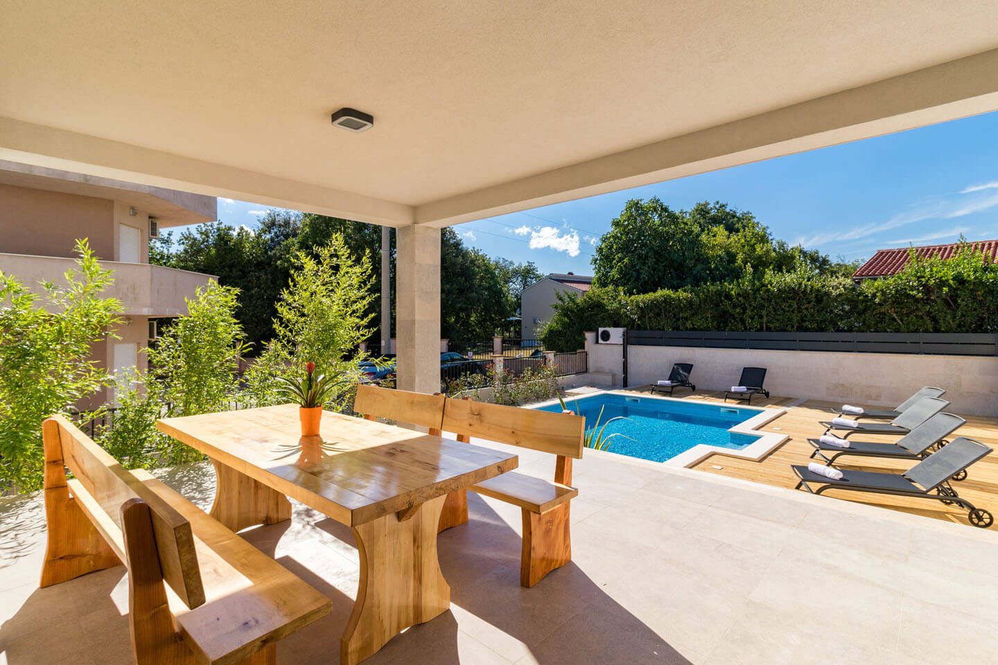 Luxury private villa Munat has a walled and gated garden, with plenty of parking spaces in the front. Behind the villa is a large heated swimming pool, 45 square metres surface (9 x 5 metres), with 10 sun loungers and some parasols. Pool towels are provided. The sunbathing terrace is covered with smart decking and many plants are growing along the garden wall. A large covered terrace has a rustic outdoor dining table and a barbecue which is hidden round the corner. A perfect spot for lazing in the sun. When you have done enough of that, there are masses of outdoor activities!