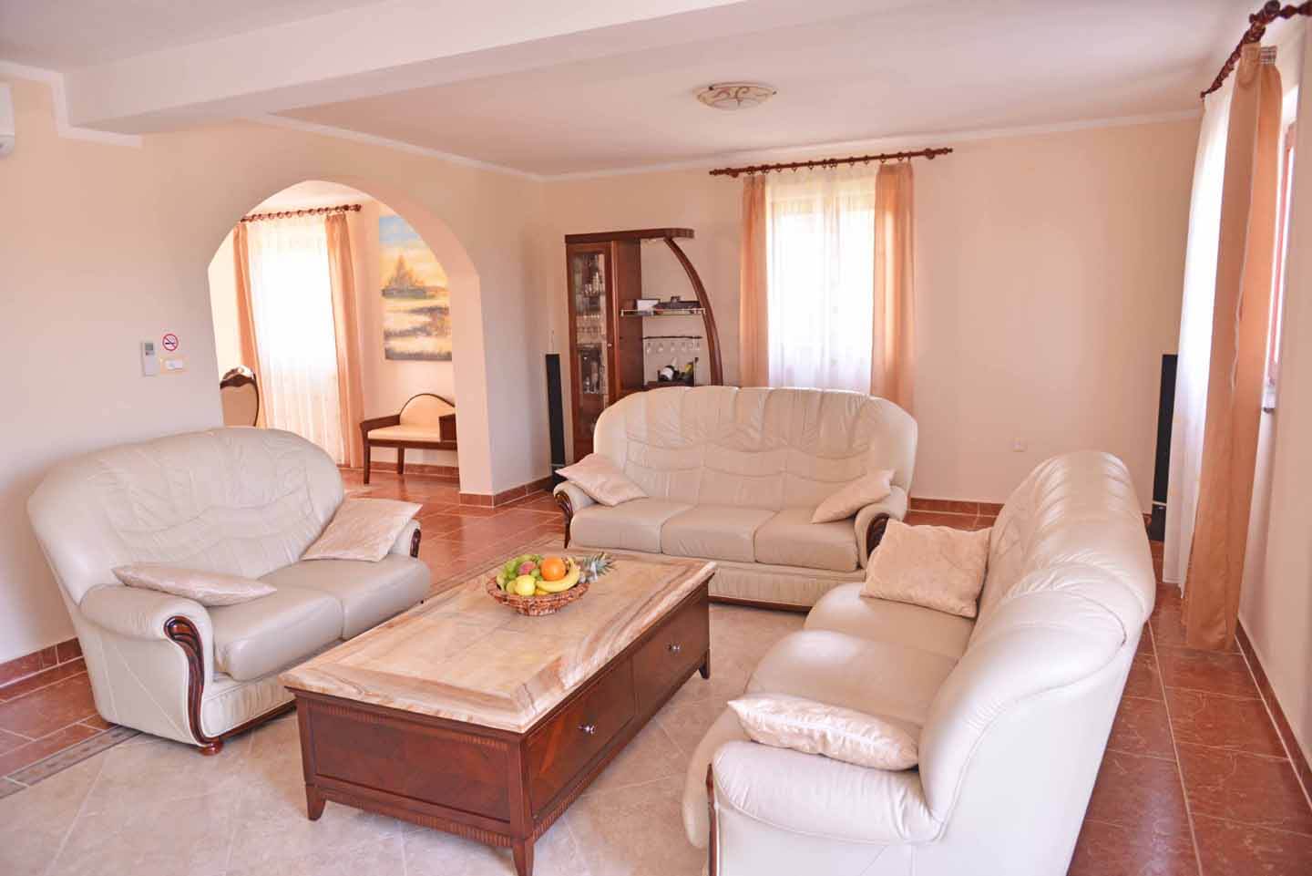 This 300 square metre villa can sleep up to ten people in five comfortable bedrooms, with ensuite bathrooms, and each is tastefully furnished in Istrian farmhouse style with beautiful wooden oak flooring. There are plenty of entertainment facilities such as table tennis, volleyball, table football, pool table, children's garden toys - a veritable playground. Adults will enjoy the sauna and Jacuzzi. The front entrance to the villa is on the upper ground floor. On this level there is a large open-plan living, dining and kitchen area. The living room has three cream sofas, a marble top coffee table, DVD player, WiFi and satellite TV and opens out onto a dining terrace with fabulous views across open countryside. The country kitchen is fully equipped with an oven, hob, fridge freezer, microwave, toaster, coffee machine, dishwasher, excellent cooking utensils and tableware. Also on the upper ground floor is a twin bedroom with ensuite shower room and a large family bathroom with a whirlpool bath and a sauna.