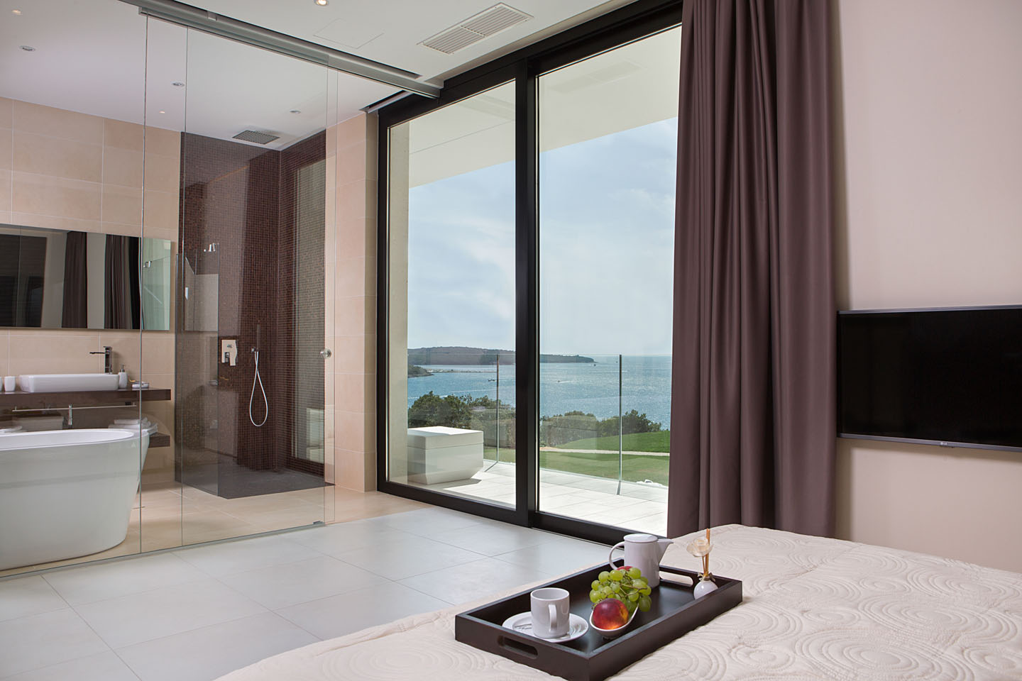 Five empress-standard double bedrooms with en-suite bathrooms with both bath and shower enclosures, individually air-conditioned and with underfloor heating are on the first floor. Each bedroom has its own TV. All the bedrooms have access to a balcony and have sea views. One of the bedrooms has twin beds which can be joined together. All other bedrooms have super king size beds. Top quality bed linen is supplied and will be changed on request. Bath towels are plentiful and are changed daily. Safes and hair dryers are also provided in each bedroom.