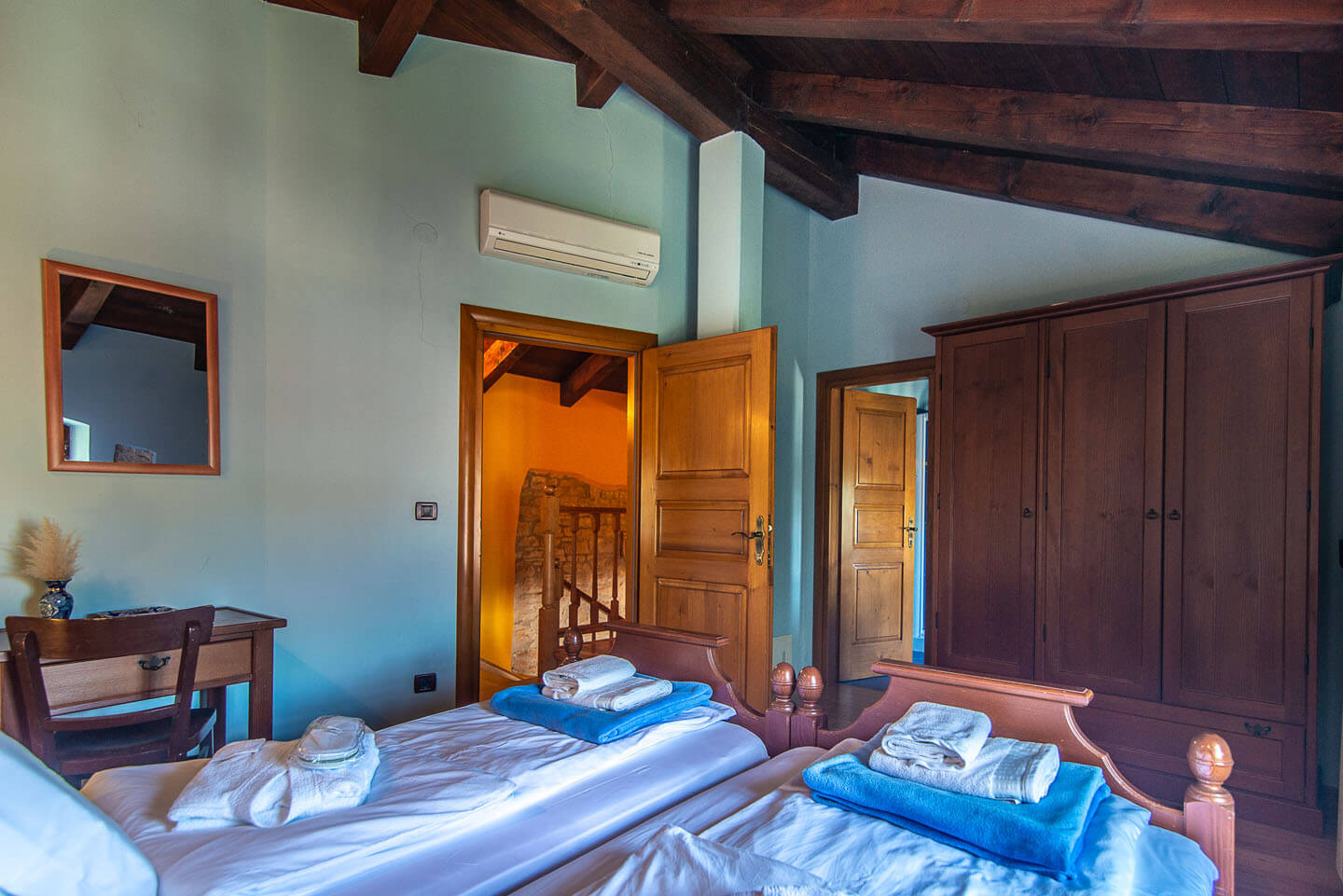 On the first floor are four wonderful bedrooms, each one with its en-suite shower room. Two bedrooms have extra large double beds, and two are furnished with twin beds. There is air conditioning in every bedroom and each has a lovely view of the green and lush garden. All the bathrooms are new and tastefully tiled with Italian tiles and bathroom furniture and fittings. Beds are very comfortable and provided with good quality bed linen and also towels. All the furnishings are in old Istrian style.