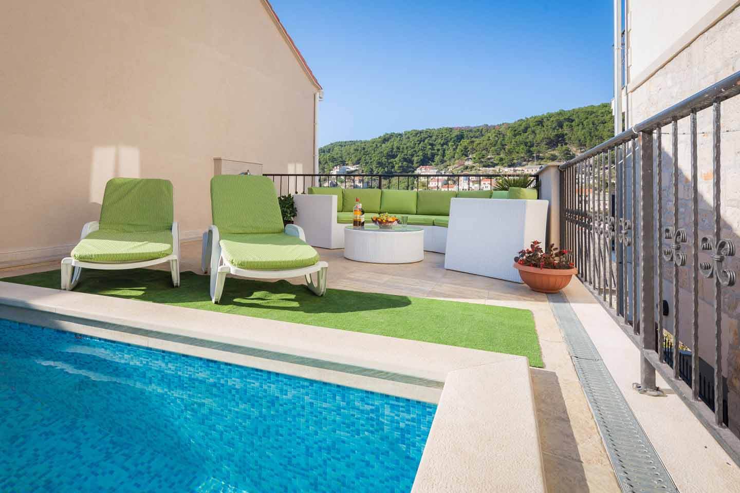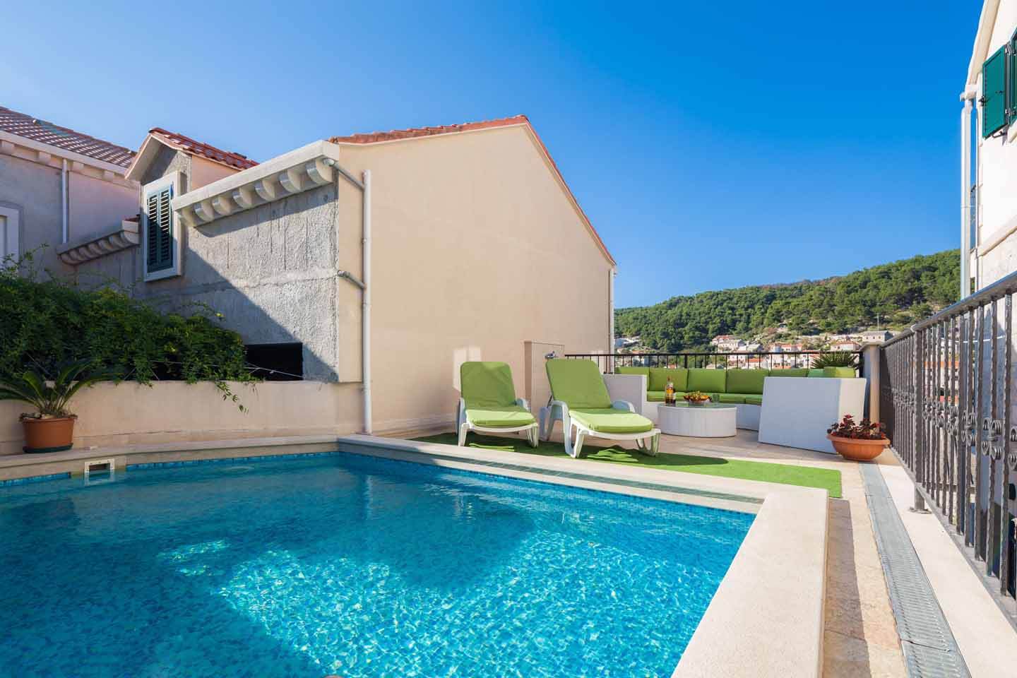 The villa is arranged on three floors, and the two upper floors are for your use. It is a large waterfront villa with long balconies, in a row of village houses. It consists of two apartments and a separate studio. The villa has over 300 square metres of living space, several terraces and a swimming pool. The villa is in the centre of the beautiful fishing town of Pucisca, close to shops, cafes and beaches.