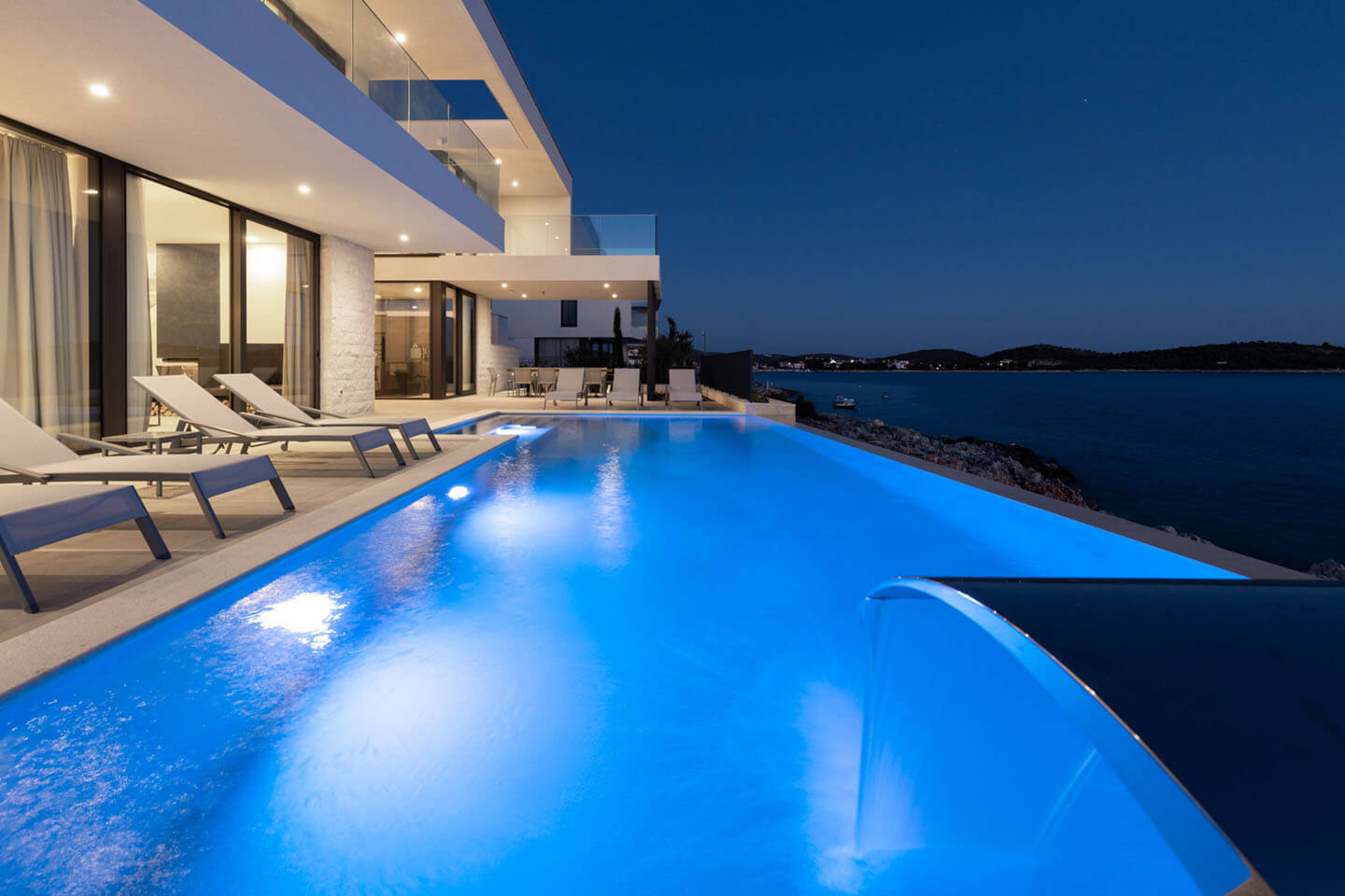 The villa was built in 2020, and comprises 400 square metres of living area and 800 square metres of garden. It is one of the triplet villas in an elite part of Rogoznica village so that the whole complex accommodates 30 people. There is WiFi, air conditioning and heating throughout and the best materials were used for building and furnishing, so that you can live in comfort and style in the luxury beach villa Carvella .