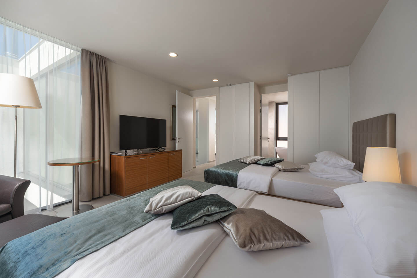 The spectacular modern staircase leads to the first floor which has four double bedrooms, all with en-suites and balcony doors. One bedroom has a beautiful bath tub, whilst the other three have showers. Three bedrooms have super king size double beds and the fourth one has large twin beds and a shower. All bed linen and towels are provided and are of top quality.