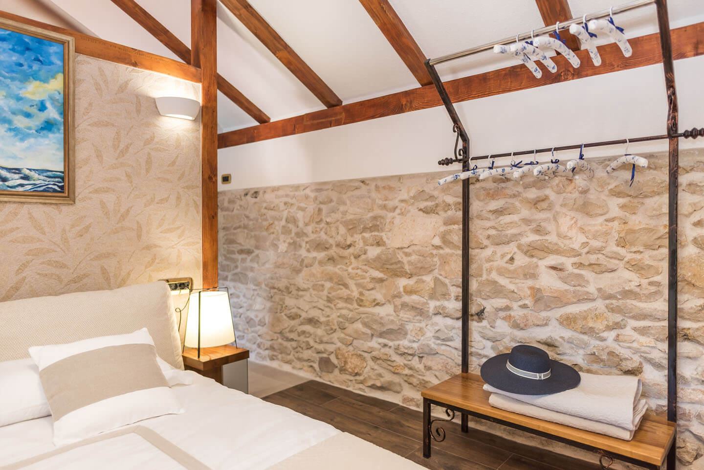 The five star, fully air-conditioned, peaceful Villa Girondella Small (two bedrooms) is a sister villa to Large Girondella (three bedrooms). The two villas belong to the same school of décor and vacation philosophy. They are really perfect in their rustic authenticity and modernity at the same time. They are attached, but have separate gardens and pools. A garden gate in the garden wall separating the two houses can be opened to link the two houses, so that a group of 10 people can holiday together as if this is one large villa with two pools. Both places are owned by the same family who have restored them with great love and care and are rightly proud of the result.