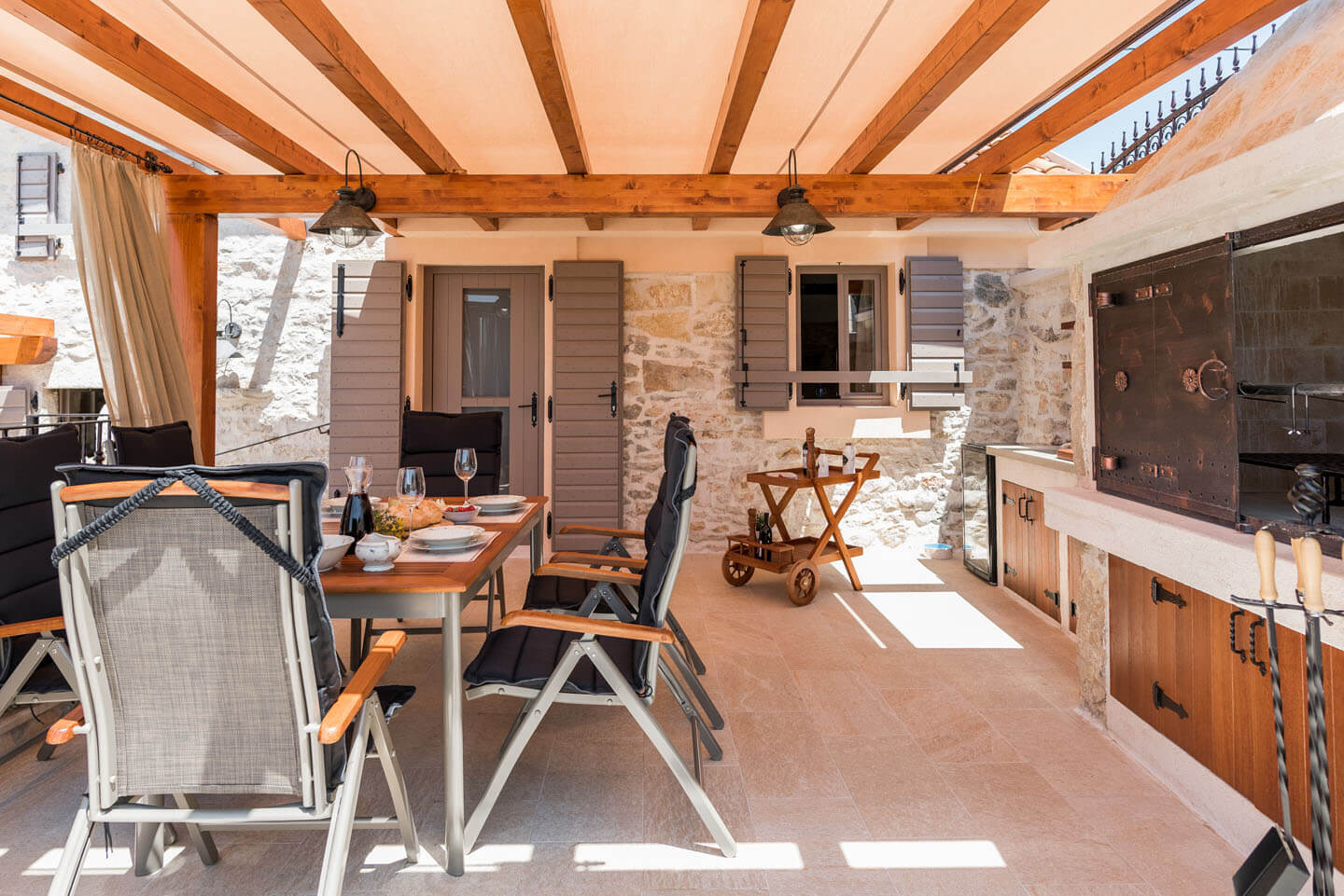 The outdoor kitchen is covered and has a barbecue and bread oven, and an outdoor dining table.
