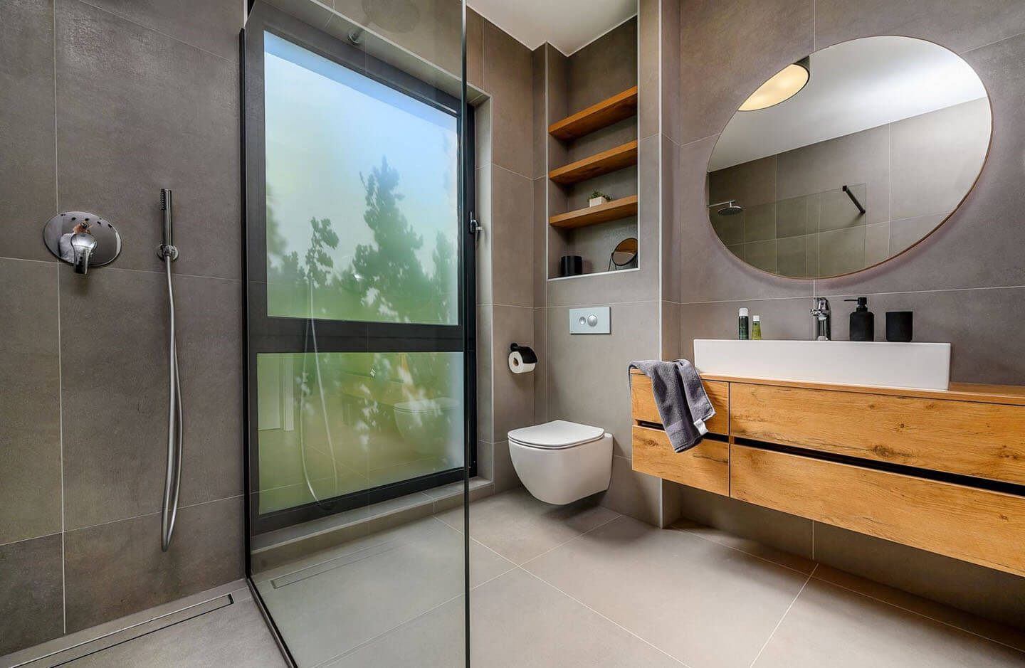 The generous living space of Luxury Villa Golden Sun with heated pool spreads over three floors and totals 450 m². You will enter the villa on the first floor level which is connected by internal stairs with the other floors.