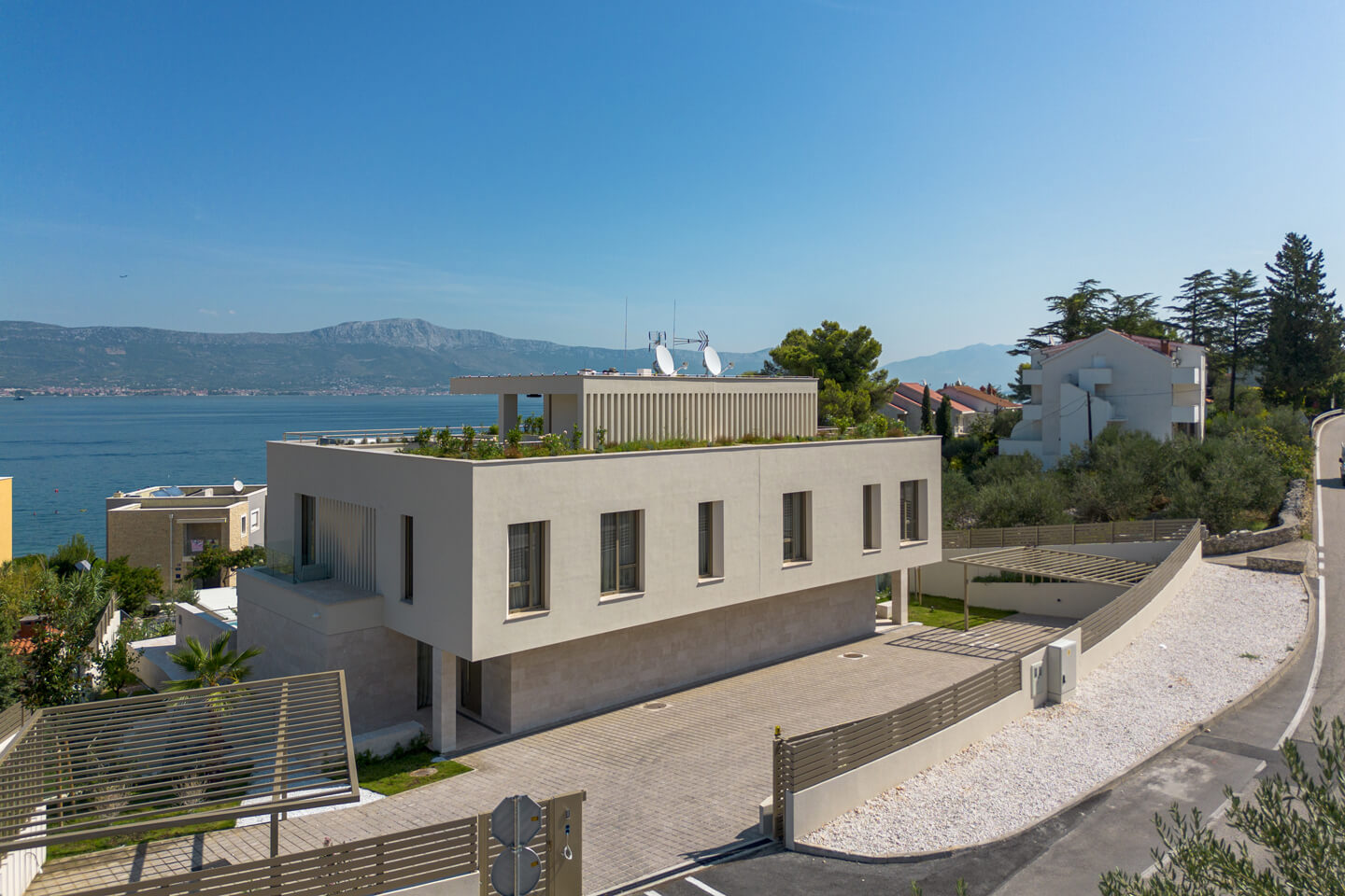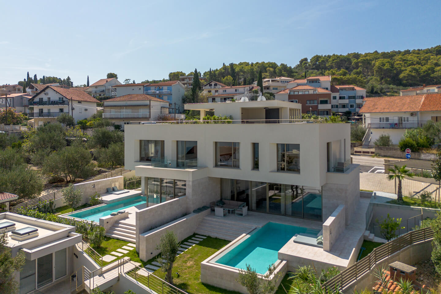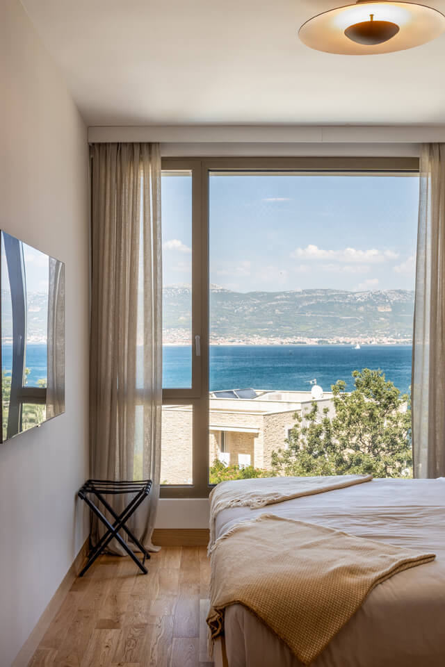Luxury Villa Afrodita is a new, modern, private family villa with pool, with a view of the sea ahead. The villa is semi-detached to its identical sister Villa Agnes and the two villas can be rented together for a larger group. Being near to the beach, this is a great place for a family or any sea lover to spend a glorious summer holiday in Croatia. Family Villa Afrodita with pool is a very spacious holiday home of 220 square metres indoors, on a 400 square metre plot, which gives you space, style, comfort with all mod cons, panoramic sea views and masses of outdoor activities. The private villa comprises three double bedrooms and three bathrooms, gym, sauna, rooftop summer kitchen and whirlpool, and a 32 square metre swimming pool. You will be spoilt for choice with things to do. Enjoy dinner at the local restaurant or venture to sophisticated Trogir with many fabulous cafes and restaurants to choose from. Visit the zip-line in Omis where you can also do white-water rafting on the river Cetina. Take a private boat trip to the magical islands of Brac and Hvar. Walk around Split like the Roman Emperor Diocletian, who built his palace there and you can still see it in al its glory. Last but not least, you are in the gourmet area for seafood lovers and Mediterranean healthy eating. You will return home rested and invigorated, ready to book again for the year ahead!
