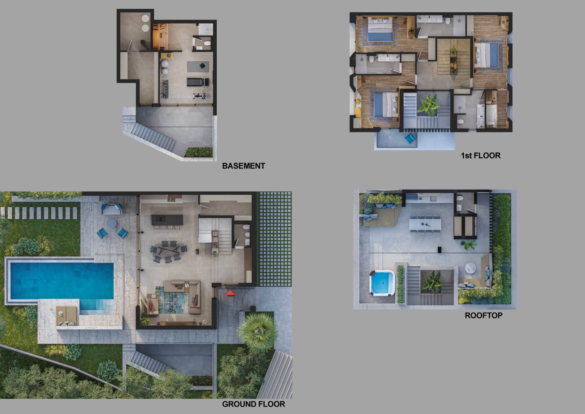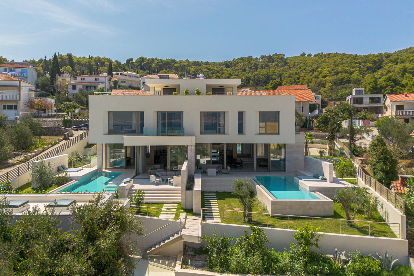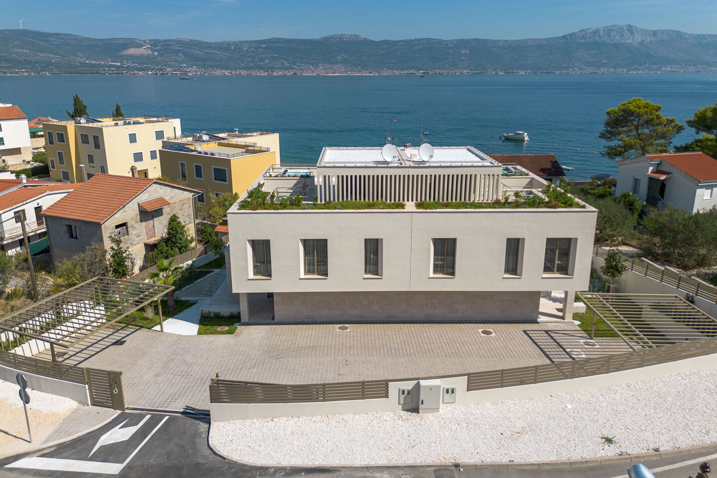 Luxury Villa Afrodita is a new, modern, private family villa with pool, with a view of the sea ahead. The villa is semi-detached to its identical sister Villa Agnes and the two villas can be rented together for a larger group. Being near to the beach, this is a great place for a family or any sea lover to spend a glorious summer holiday in Croatia. Family Villa Afrodita with pool is a very spacious holiday home of 220 square metres indoors, on a 400 square metre plot, which gives you space, style, comfort with all mod cons, panoramic sea views and masses of outdoor activities. The private villa comprises three double bedrooms and three bathrooms, gym, sauna, rooftop summer kitchen and whirlpool, and a 32 square metre swimming pool. You will be spoilt for choice with things to do. Enjoy dinner at the local restaurant or venture to sophisticated Trogir with many fabulous cafes and restaurants to choose from. Visit the zip-line in Omis where you can also do white-water rafting on the river Cetina. Take a private boat trip to the magical islands of Brac and Hvar. Walk around Split like the Roman Emperor Diocletian, who built his palace there and you can still see it in al its glory. Last but not least, you are in the gourmet area for seafood lovers and Mediterranean healthy eating. You will return home rested and invigorated, ready to book again for the year ahead!