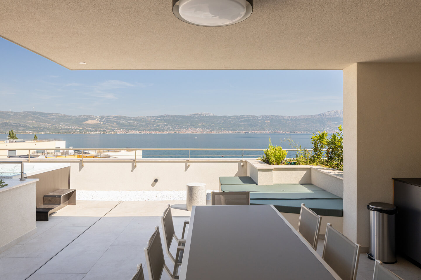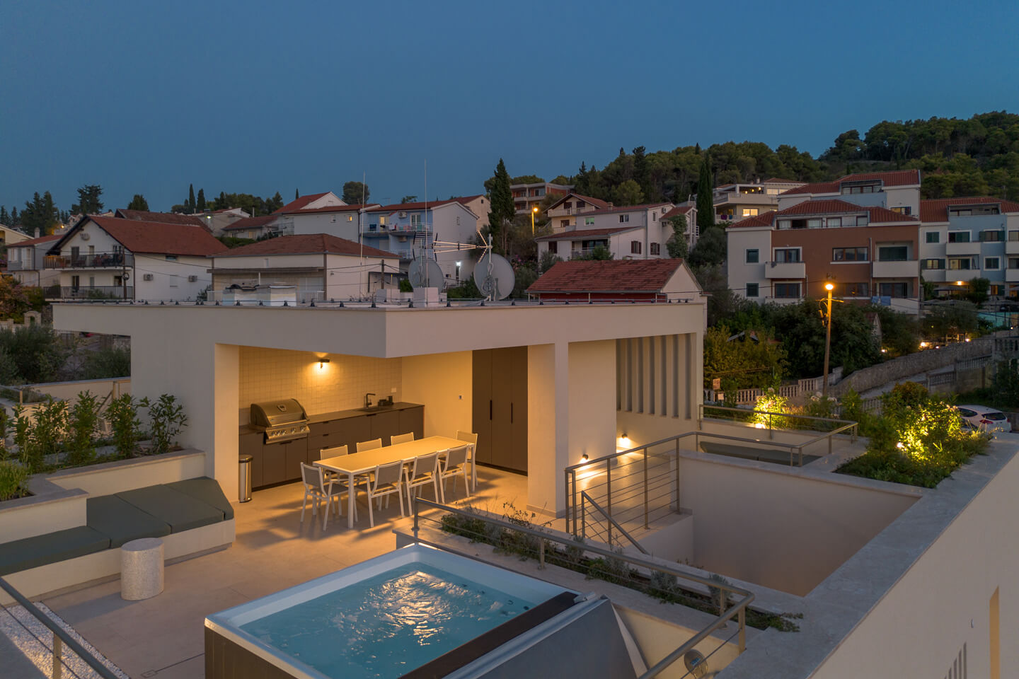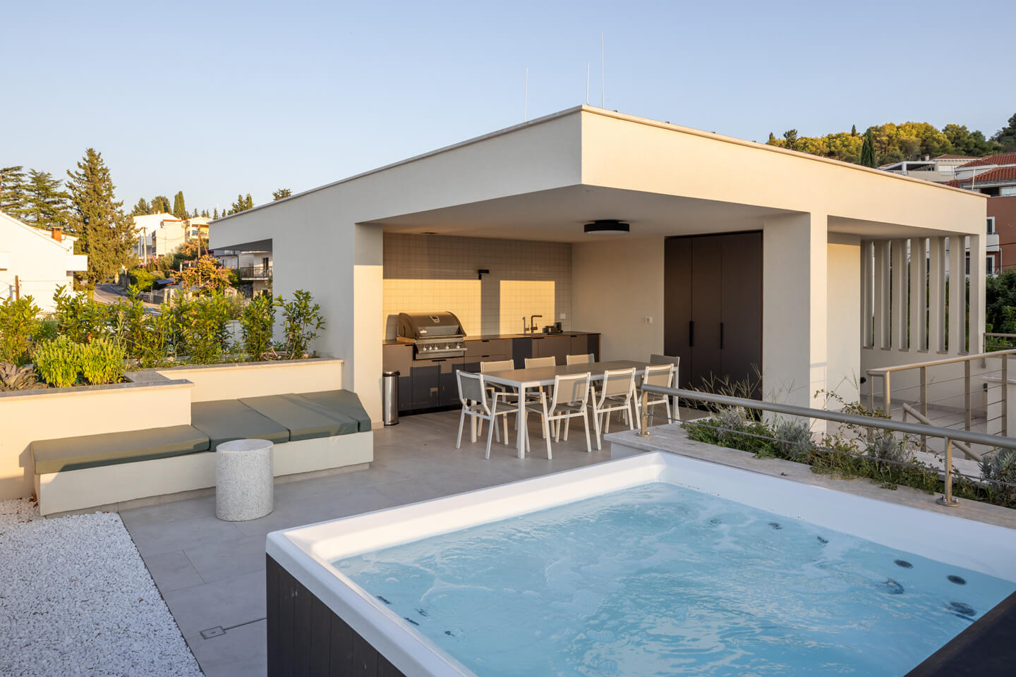A stunning rooftop terrace, reached by a white stone staircase, where you can barbecue and enjoy the sunset cocktails, dipping into the whirlpool. The rooftop outdoor kitchen is equipped with a fridge, sink and gas barbecue and a dining table for 8 people. Enjoy with your family and friends the unforgettable view of the Adriatic panorama.