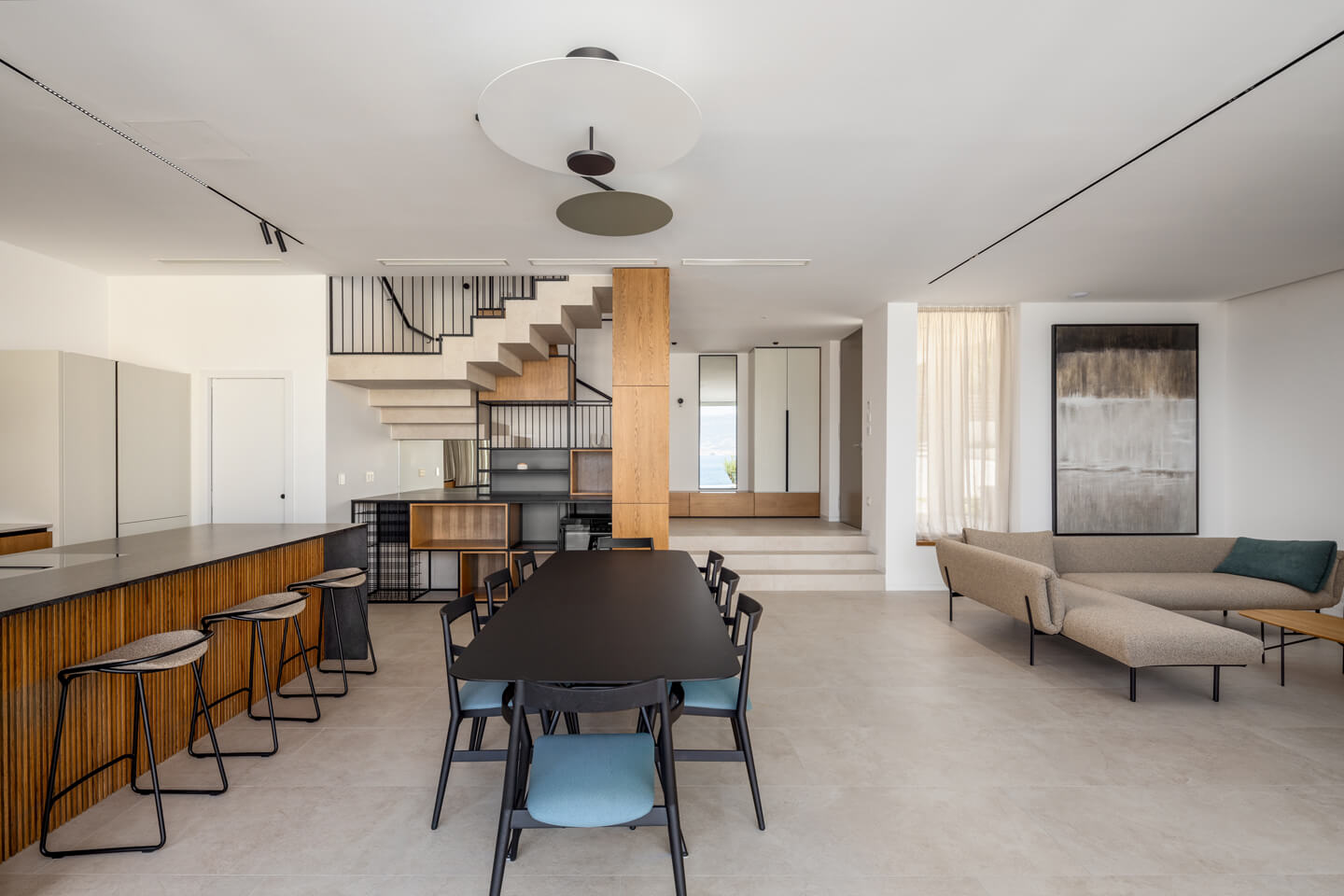 The ground floor comprises a large and sunny open space with a kitchen, kitchen island, dining area, a sitting room with plentiful sofas and flat screen TV with sound bar. The modern kitchen is equipped with a fridge/freezer, oven, hob, dishwasher, kettle, coffee grinder, kitchen utensils and stylish tableware. There is a kitchen island with three bar stools and a hob. The dining table sits 8 people comfortably and the whole area is a great place to socialise. Your feeling of wellbeing is enhanced with the summer sun flooding the space and stylish lighting, furniture and paintings surrounding you. And of course, the inviting pool simmering just outside,