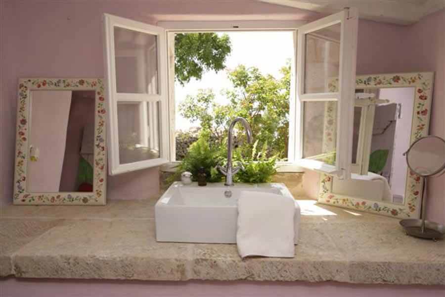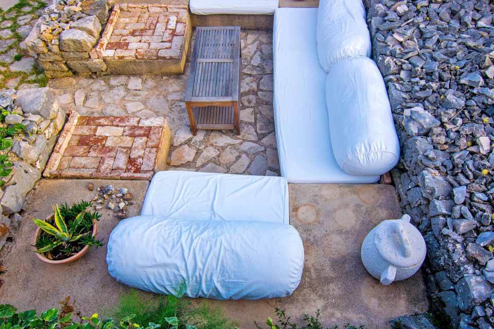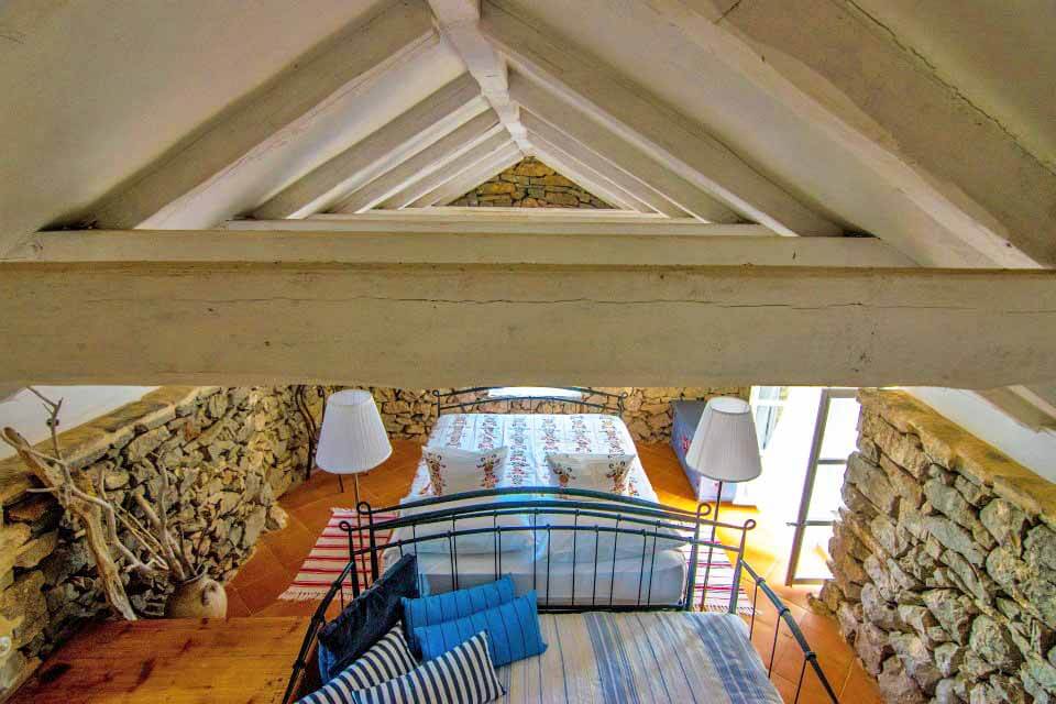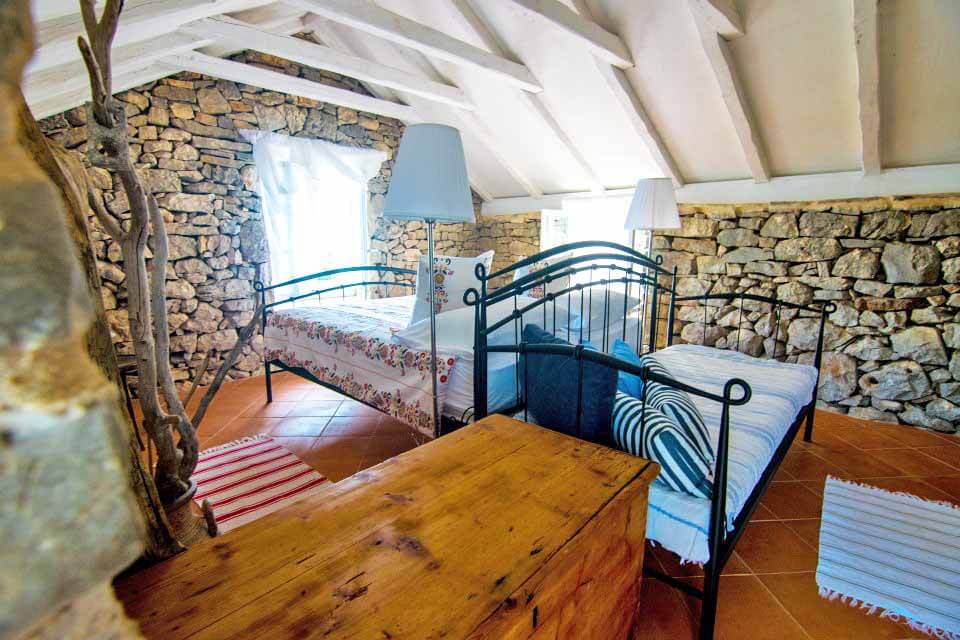 Upstairs are two large double bedrooms with en-suite showers, each bedroom comprising of 35 square metres. The bedrooms are accessed via seperate external stone staircases. Old features are retained, even pieces of rock around which the farmhouse was constructed. Terracotta floors and white ceiling beams are a good backdrop for the two single white beds with exquisite vintage bed linen. In the second bedroom, rough exposed stone walls, terracotta floor and a canopied white double bed are simple and luxurious at the same time. Sparsely decorated with chosen pieces of old furniture and with light, billowing curtains, these bedrooms offer you Hvar living how it used to be. There is plenty of lovely bed linen and towels.