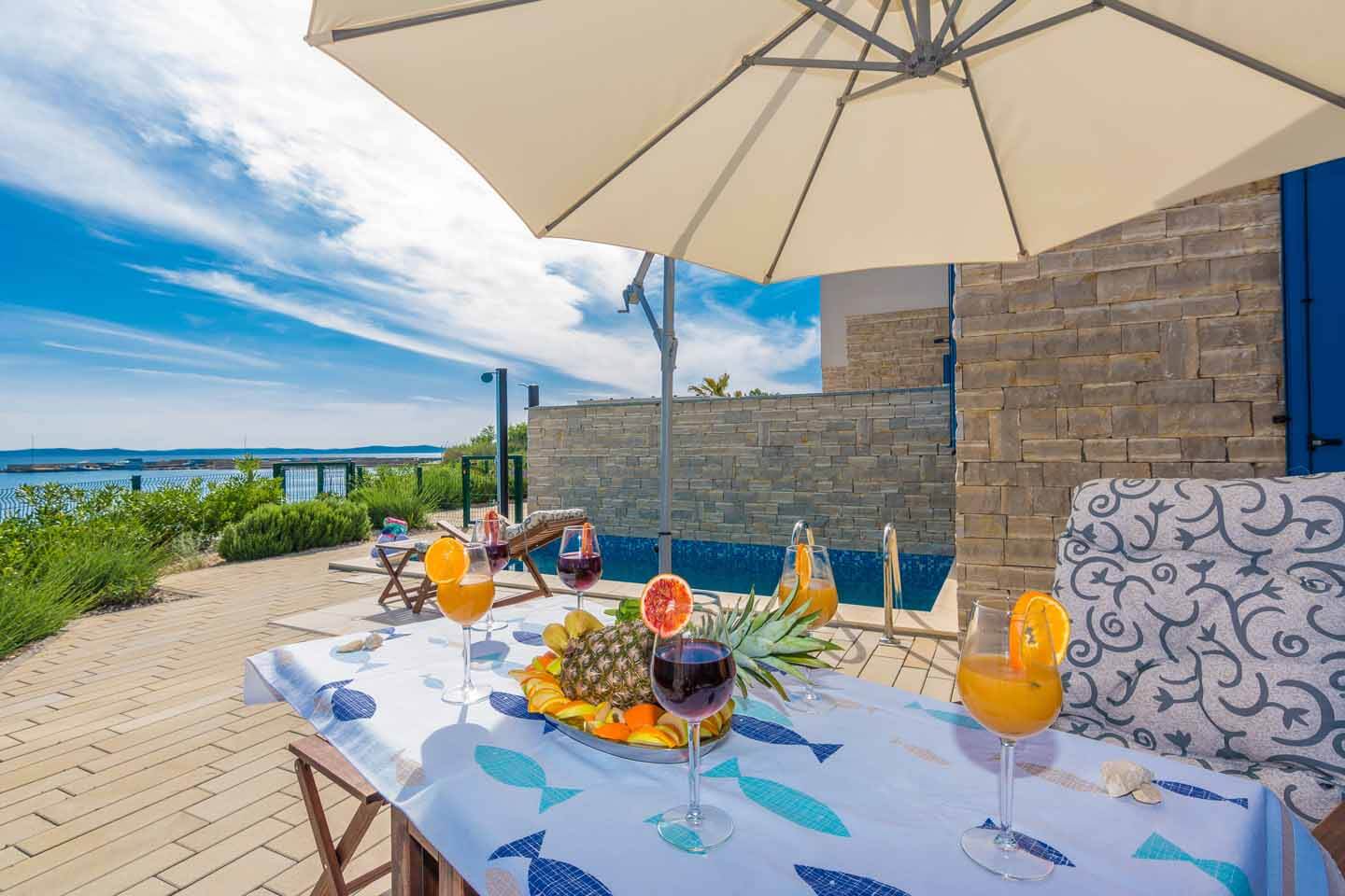 Just 20 km from the great town of Zadar in the village Privlaka, a small complex of ten modern villas has been built right by a sandy beach. In a peaceful and sunny environment, it is fitting to call them Serenity Villas, all of which face the sea and have a coastal path winding right outside them. The beach is just 10 metres away. The Villa No 1 is one of ten very similar modern beachfront villas, and it is the end villa. There are fantastic sandy and pebbly beaches in the area, some of them several kilometres long. Walk, run, cycle, make sandcastles, snorkel, windsurf, go scuba diving or bungee jumping from the Maslenica bridge. This child friendly spot, which also has all the elements of a great stay for adults, will satisfy customers' every need. Visit the especially charming royal town of Nin, just 10 minutes' drive from the villa for more beaches and good food. We recommend a day trip to the unforgettable Krka waterfalls, or Plitvice lakes, taking in the bear sanctuary and a day boat trip to the Kornati islands which have the bluest sea in the world (official!). There are numerous restaurants, cafe bars, supermarkets and shops in Privlaka if you do not wish to venture much further away. Trips to Sibenik, Primosten, Trogir and Split are easily manageable.
